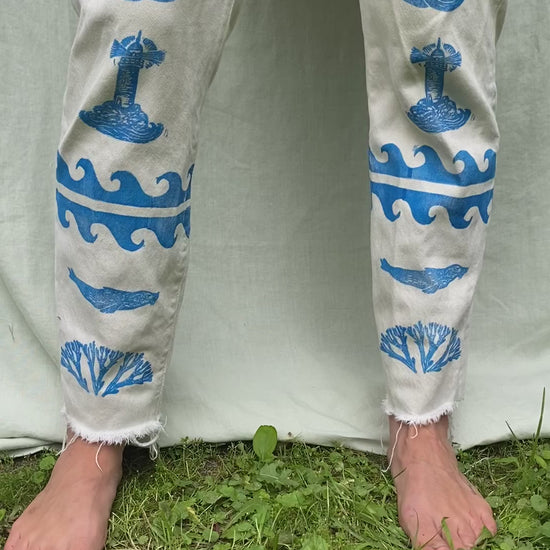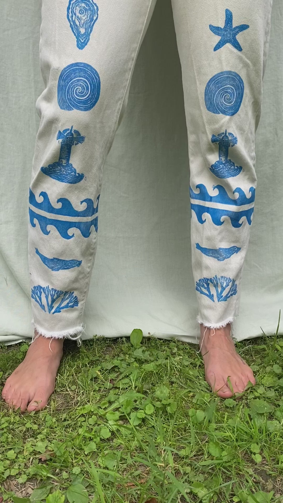 Up-cycled, one of a kind, hand-printed with hand-carved stamps, inspired by the beauty and magic of the moon, the sea, and all their feminine mysteries.