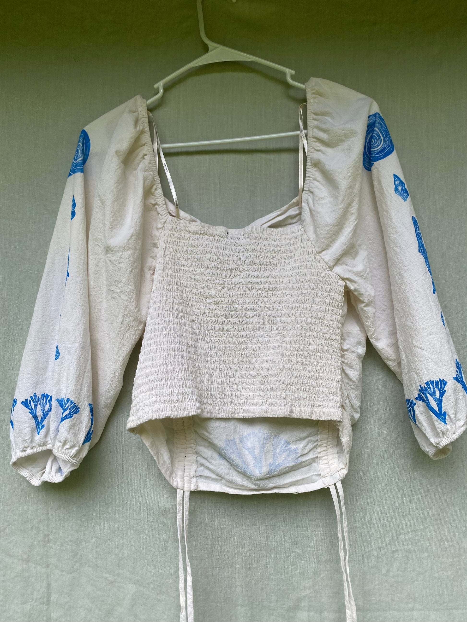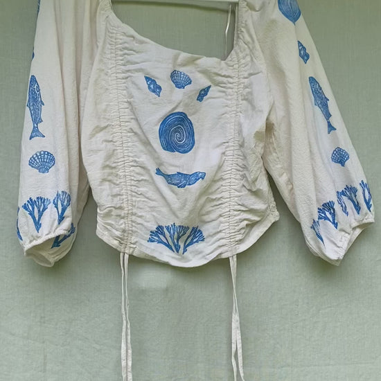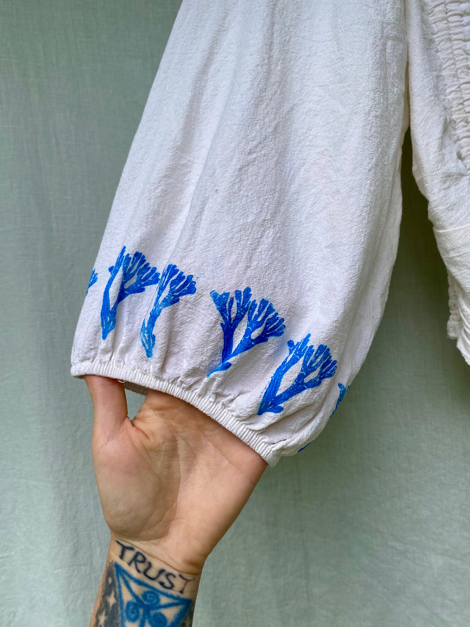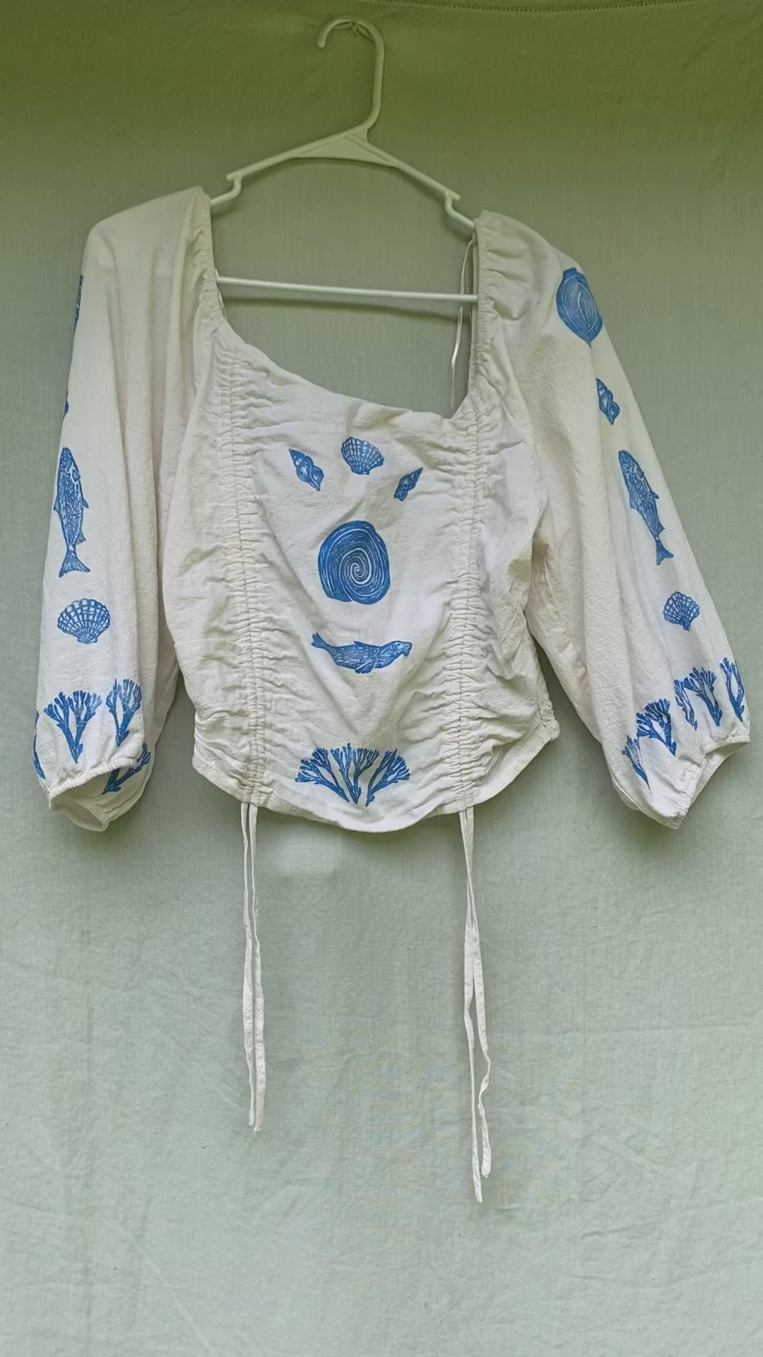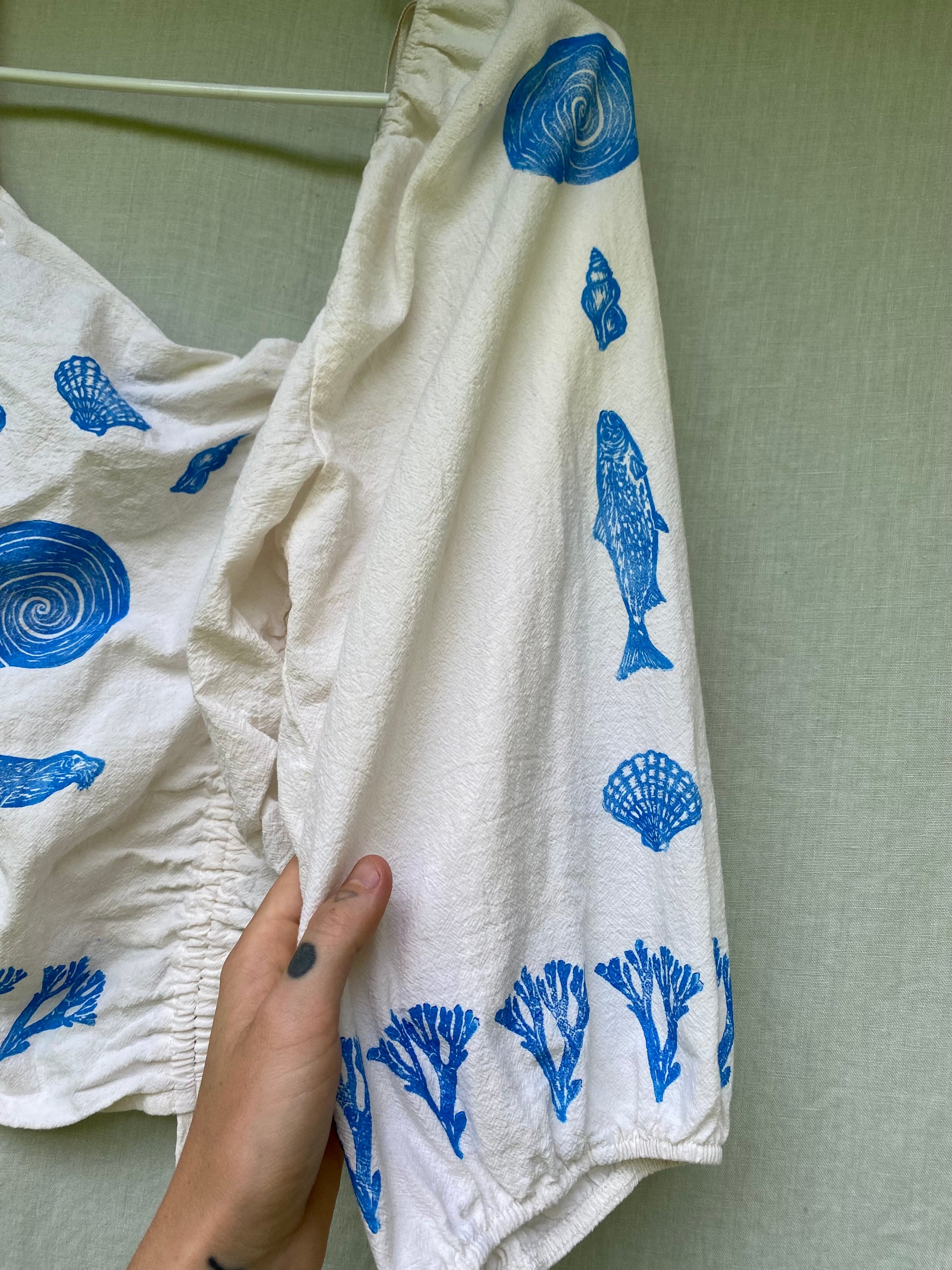 Up-cycled, one of a kind, hand-printed with hand-carved stamps, inspired by the beauty and magic of the moon, the sea, and all their feminine mysteries.