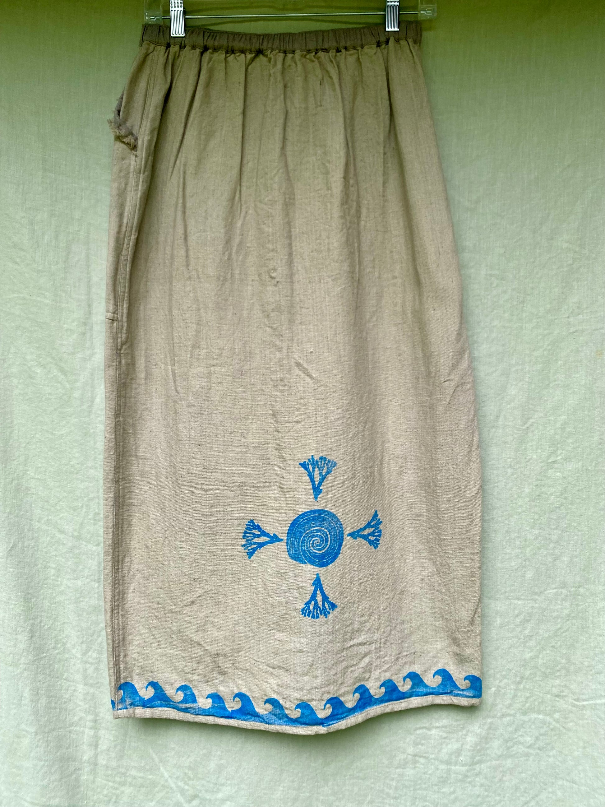Up-cycled, one of a kind, hand-printed with hand-carved stamps, inspired by the beauty and magic of the moon, the sea, and all their feminine mysteries.