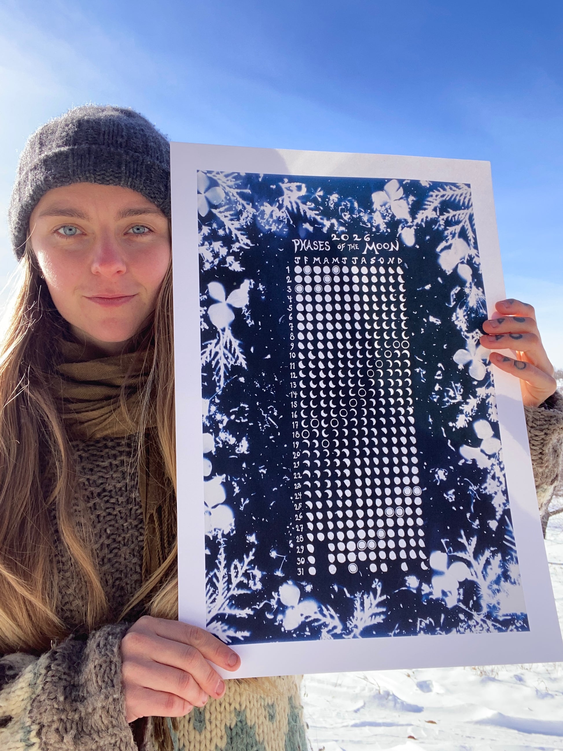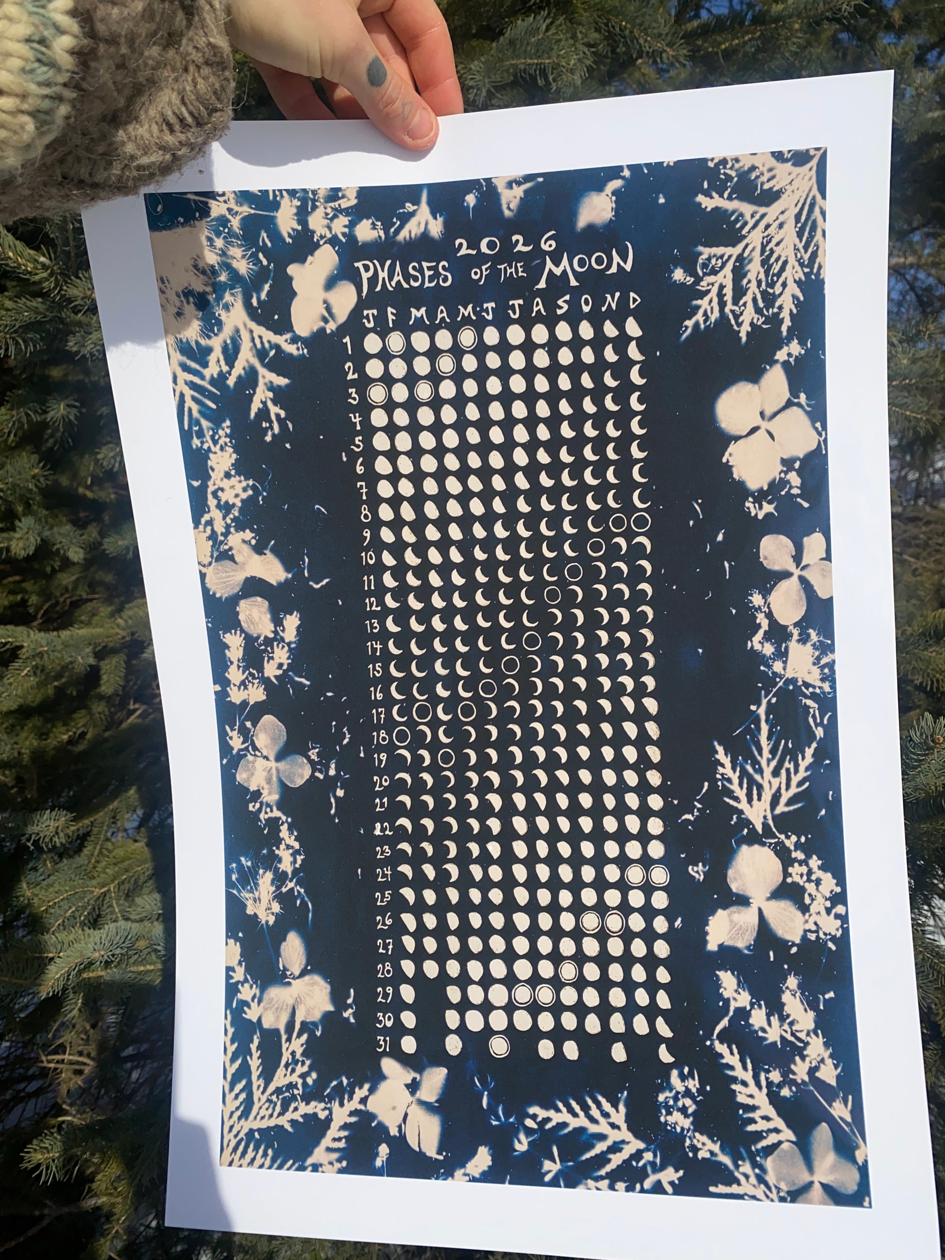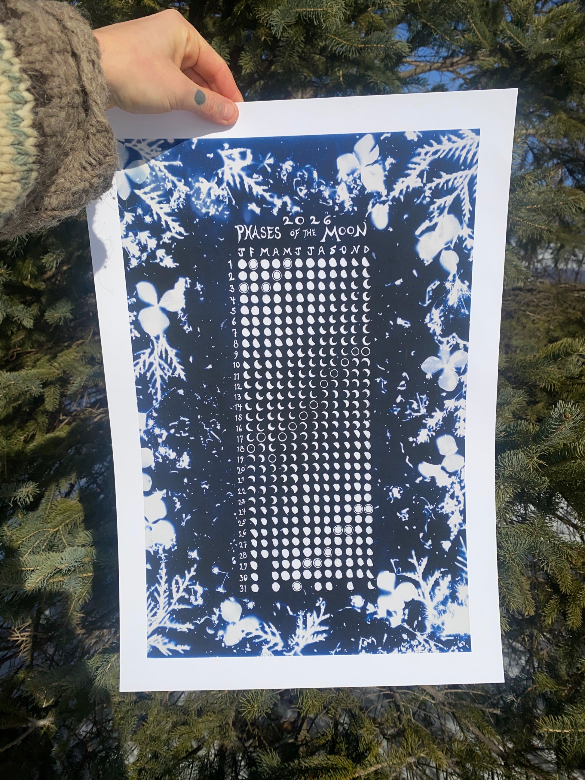 This year's moon phase calender is a cyanotype print, which is a photographic process of chemicals reacting to UV light exposure creating a blue background to contrast the white where leaves and flowers were placed. Here I've included cedar leaves, hydrangea, lavender, queen annes lace and a puerh loose leaf tea scattered throughout. The moons are all hand drawn, totaling many hours of concentrated focus and intention of the completion of this art work. I worked by candlelight and in snow storms, coming to terms that my circle drawing will never beat a quick computer generation of a circle - but I prefer the human imperfection.