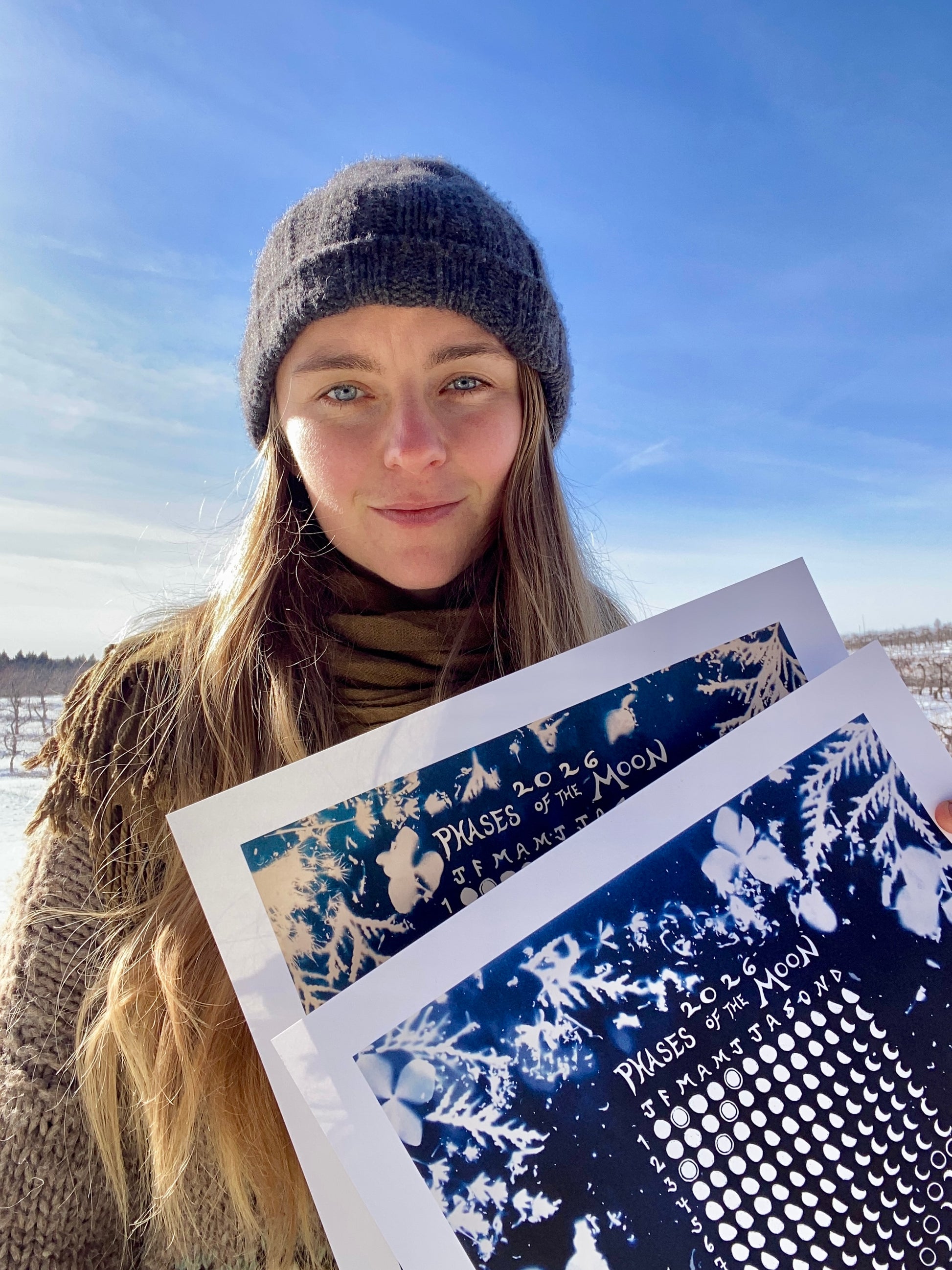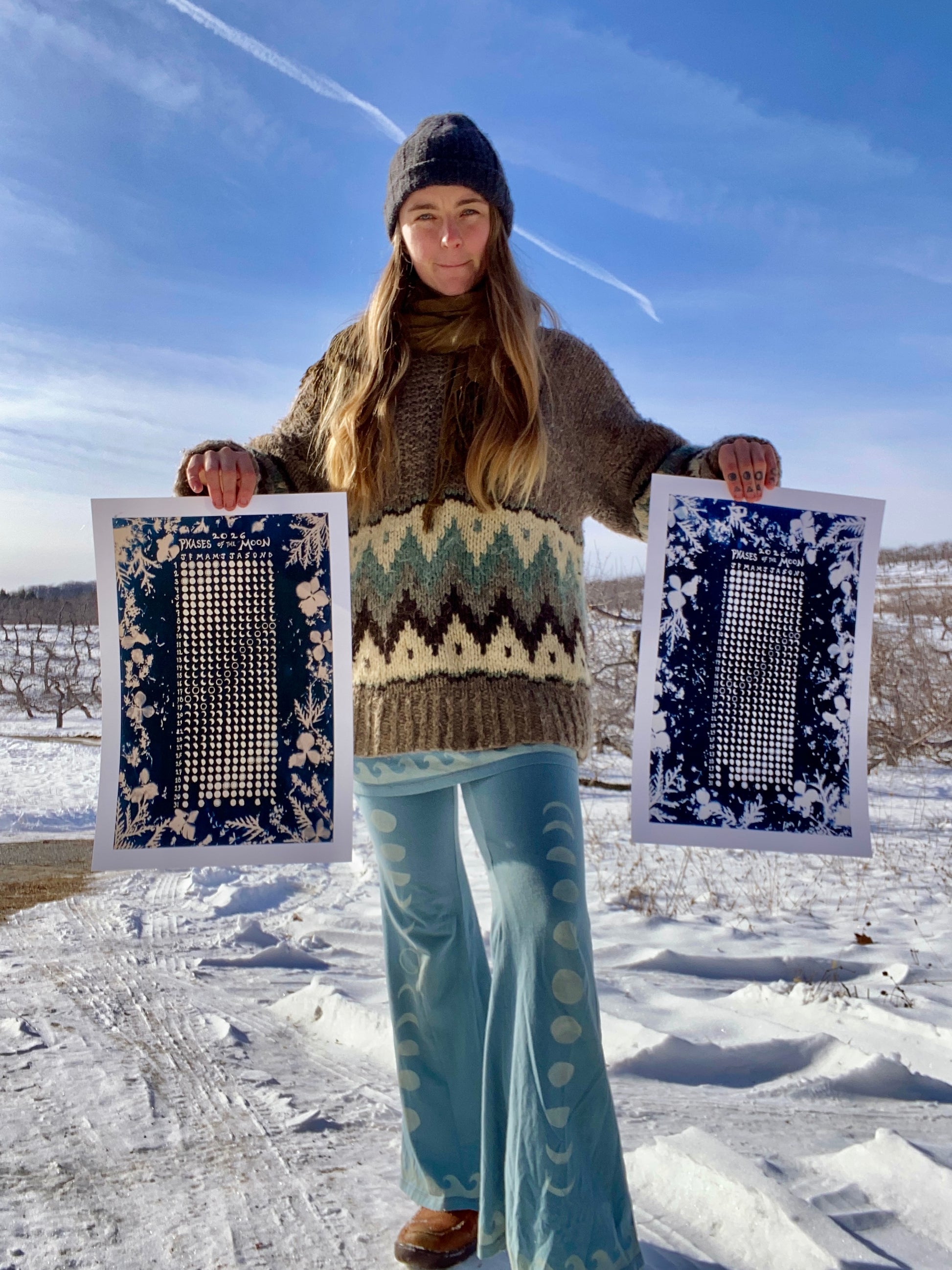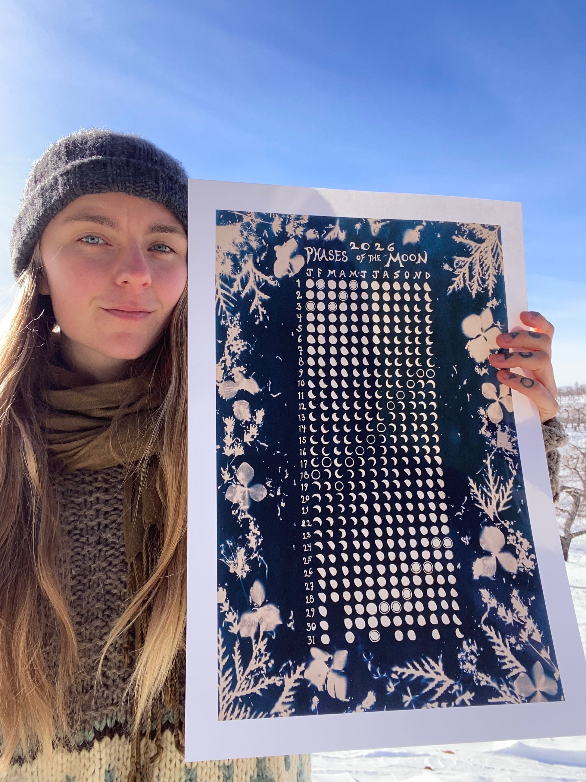 This year's moon phase calender is a cyanotype print, which is a photographic process of chemicals reacting to UV light exposure creating a blue background to contrast the white where leaves and flowers were placed. Here I've included cedar leaves, hydrangea, lavender, queen annes lace and a puerh loose leaf tea scattered throughout. The moons are all hand drawn, totaling many hours of concentrated focus and intention of the completion of this art work. I worked by candlelight and in snow storms, coming to terms that my circle drawing will never beat a quick computer generation of a circle - but I prefer the human imperfection.
