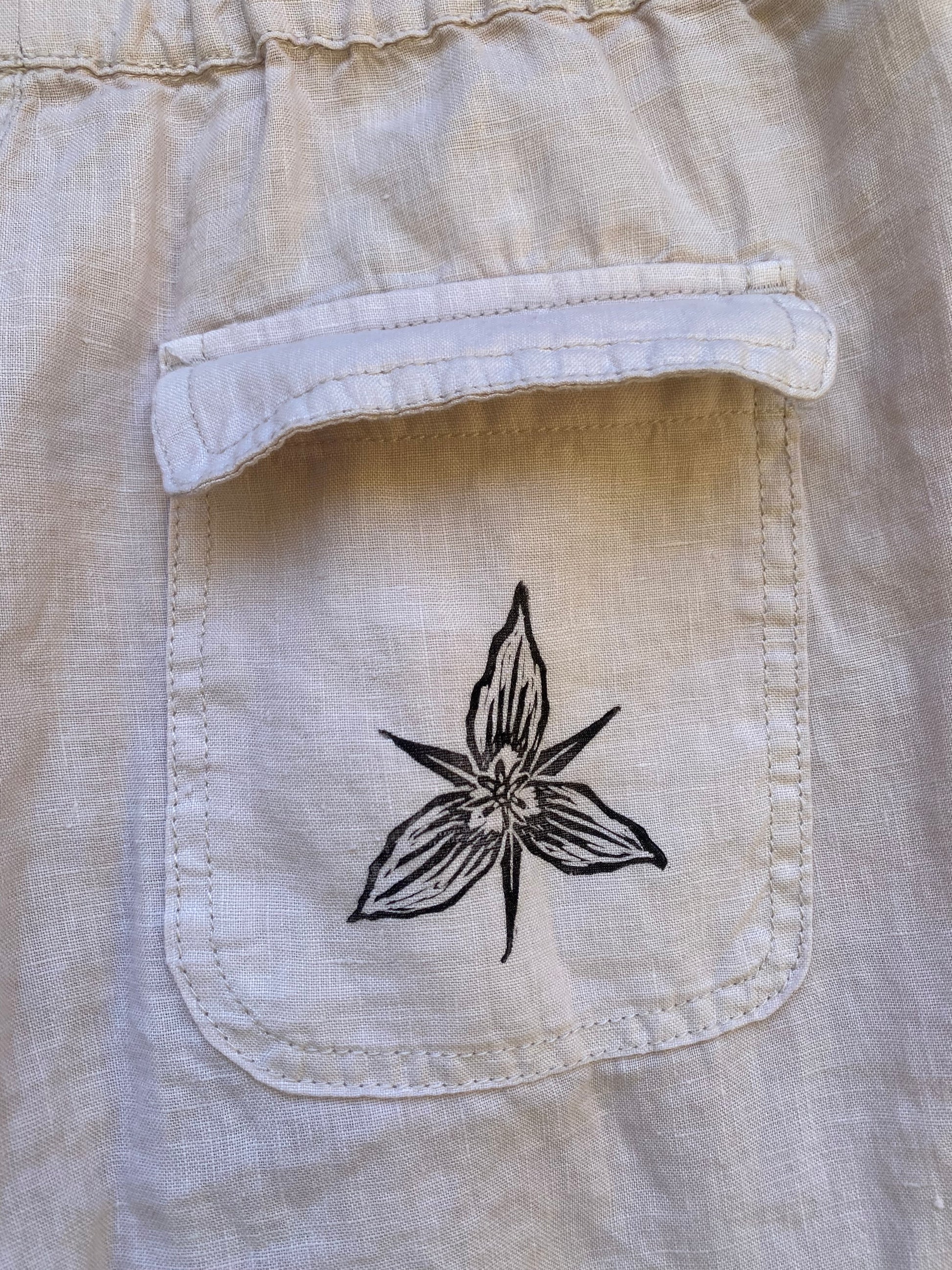 Up-cycled, one of a kind, hand-printed with hand-carved stamps, inspired by the beauty and magic of Spring in full bloom.