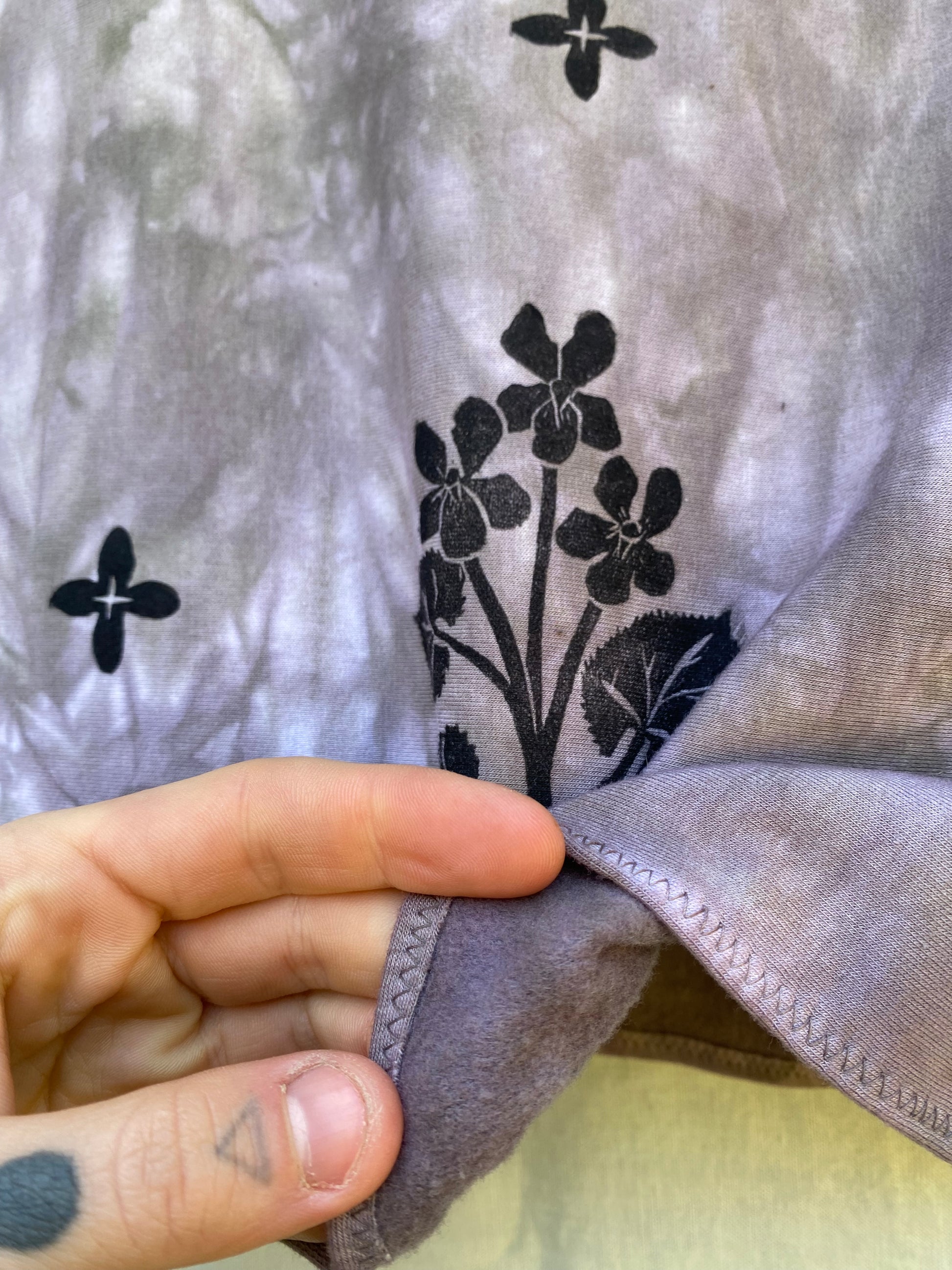 Up-cycled, one of a kind, hand-printed with hand-carved stamps, inspired by the beauty and magic of Spring in full bloom.