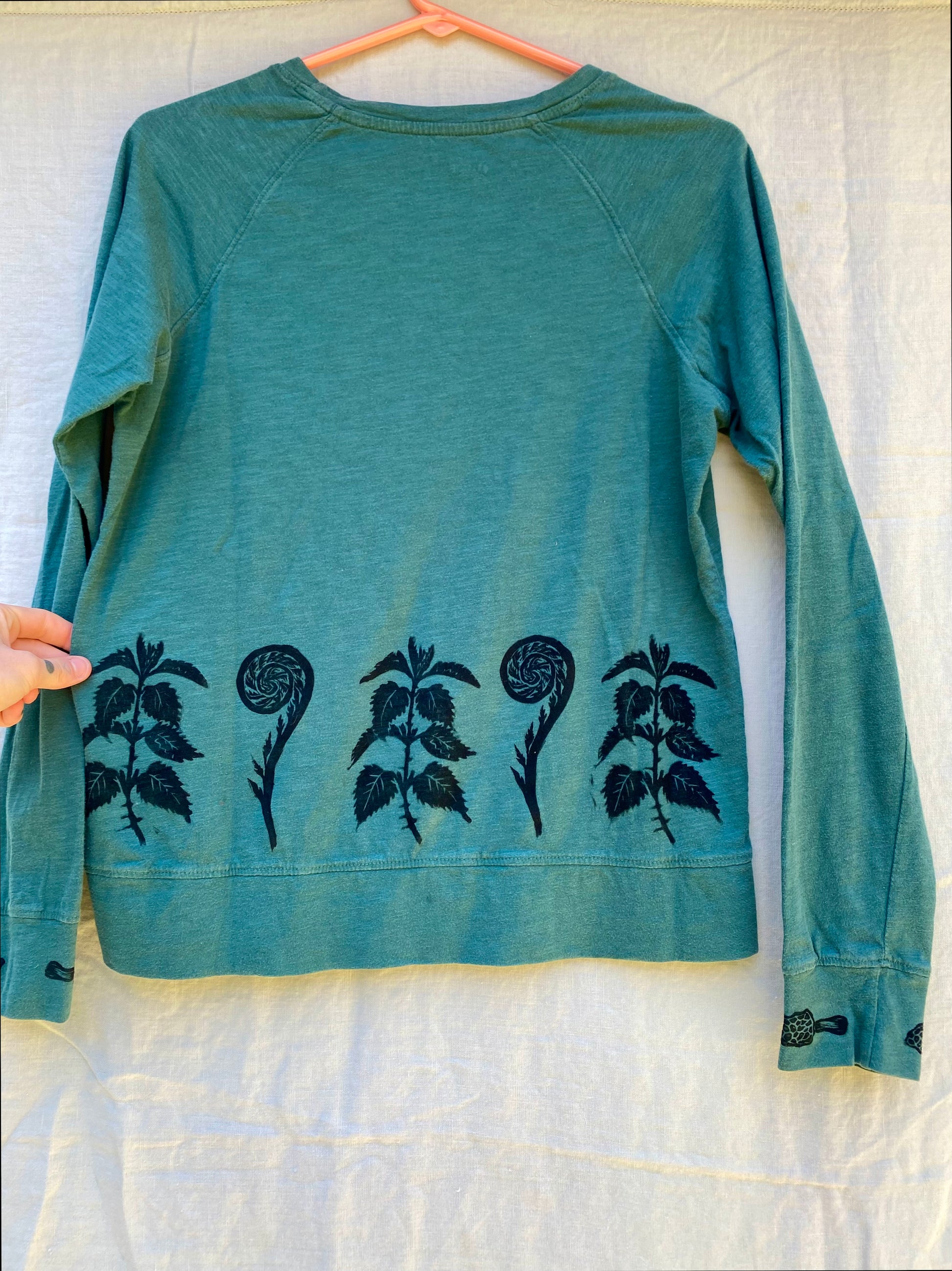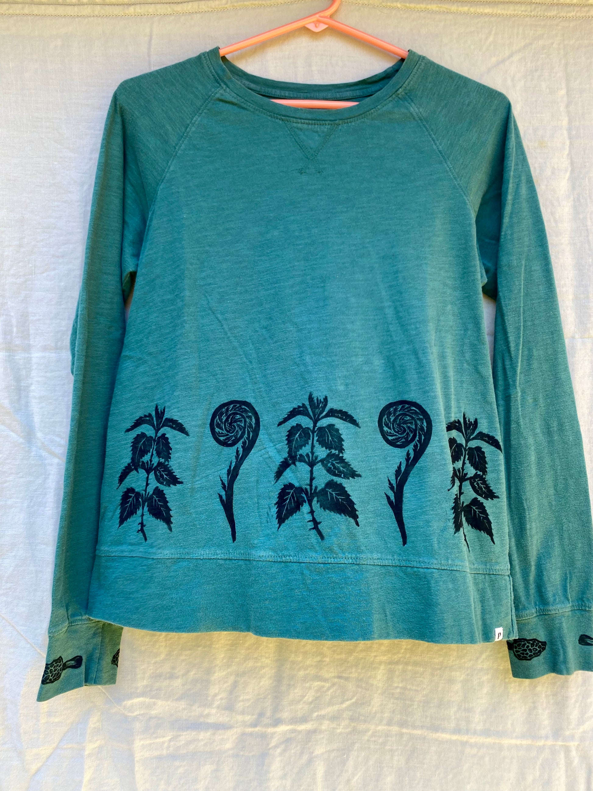 Up-cycled, one of a kind, hand-printed with hand-carved stamps, inspired by the beauty and magic of Spring in full bloom.