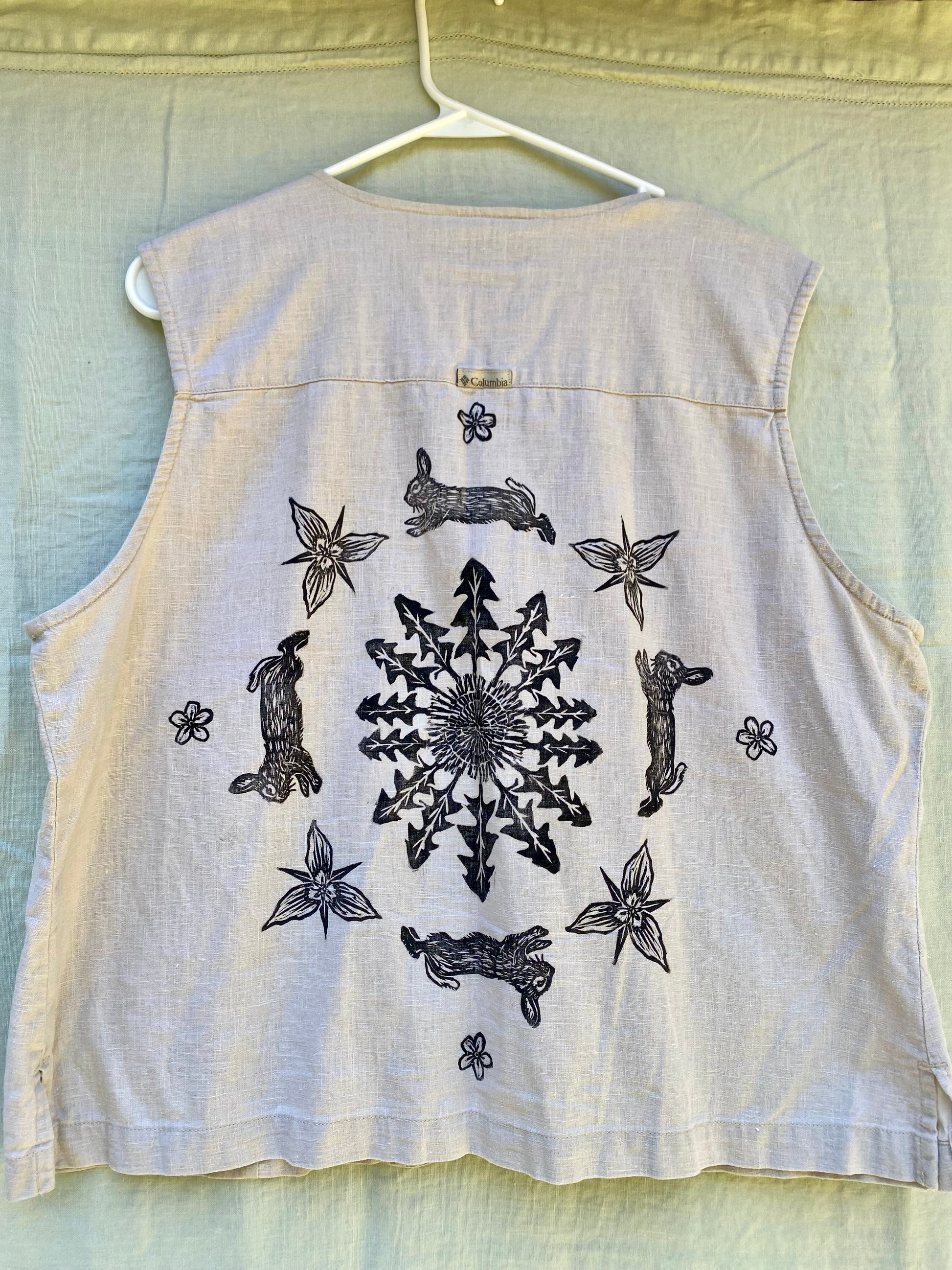 Up-cycled, one of a kind, hand-printed with hand-carved stamps, inspired by the beauty and magic of Spring in full bloom.