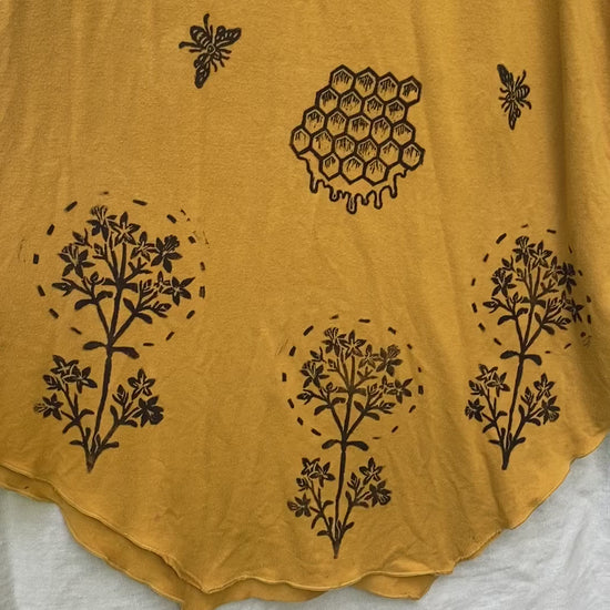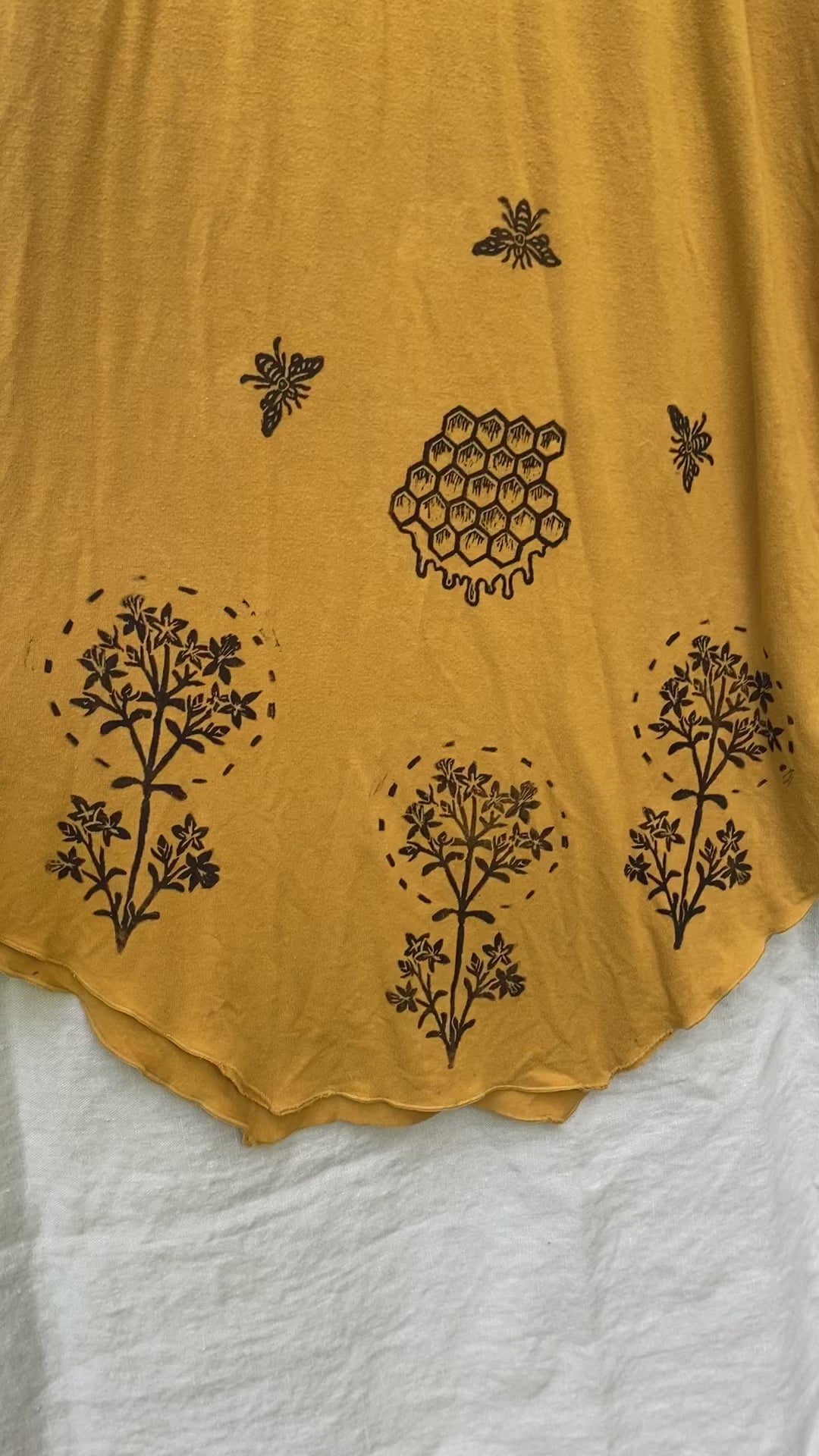 Up-cycled, one of a kind, hand-printed with hand-carved stamps, inspired by the beauty and magic of the early summer glory, solstice time, the full strawberry moon.