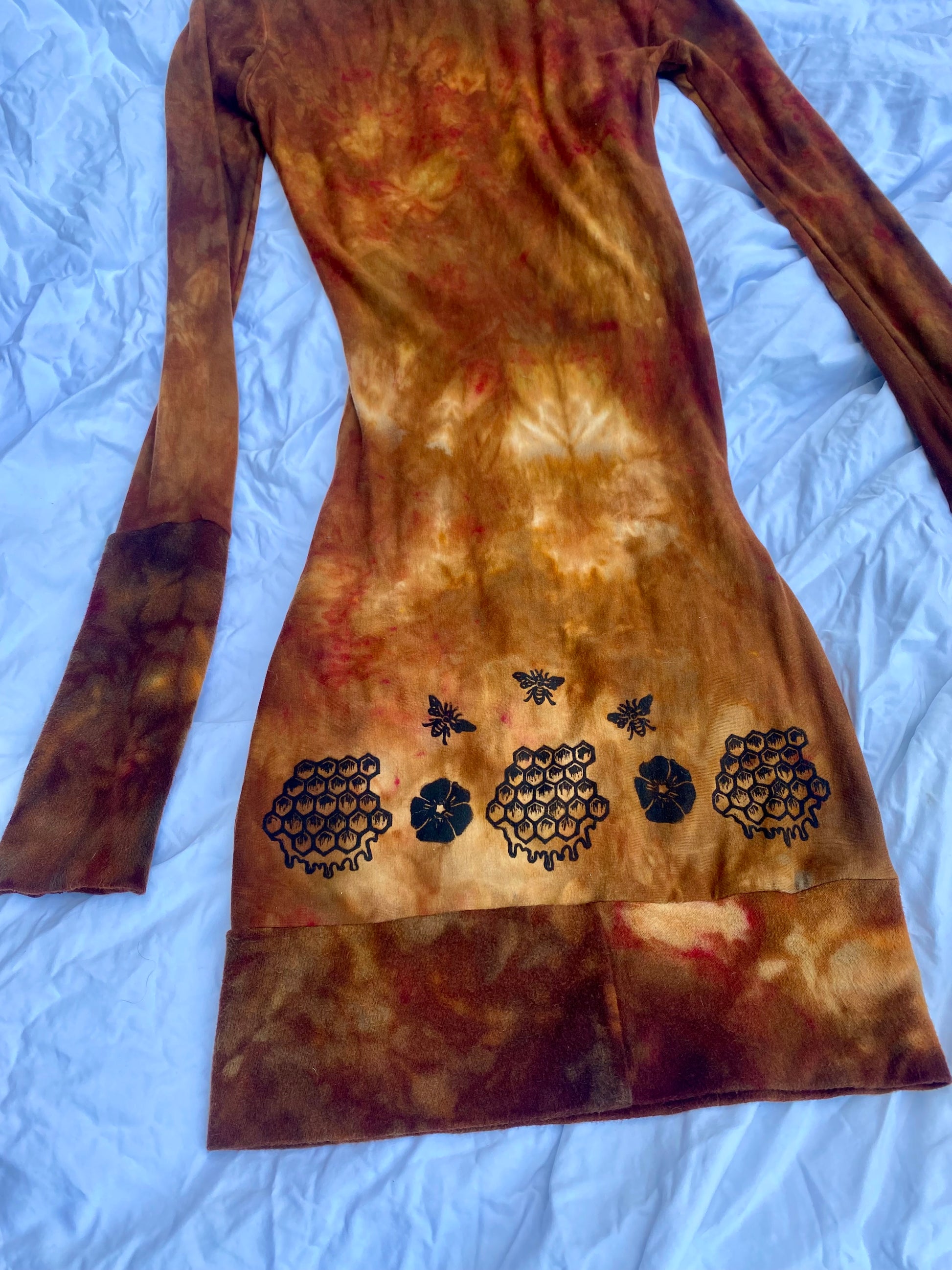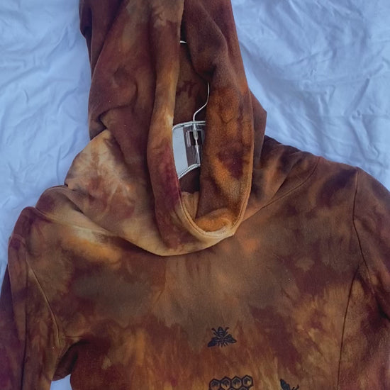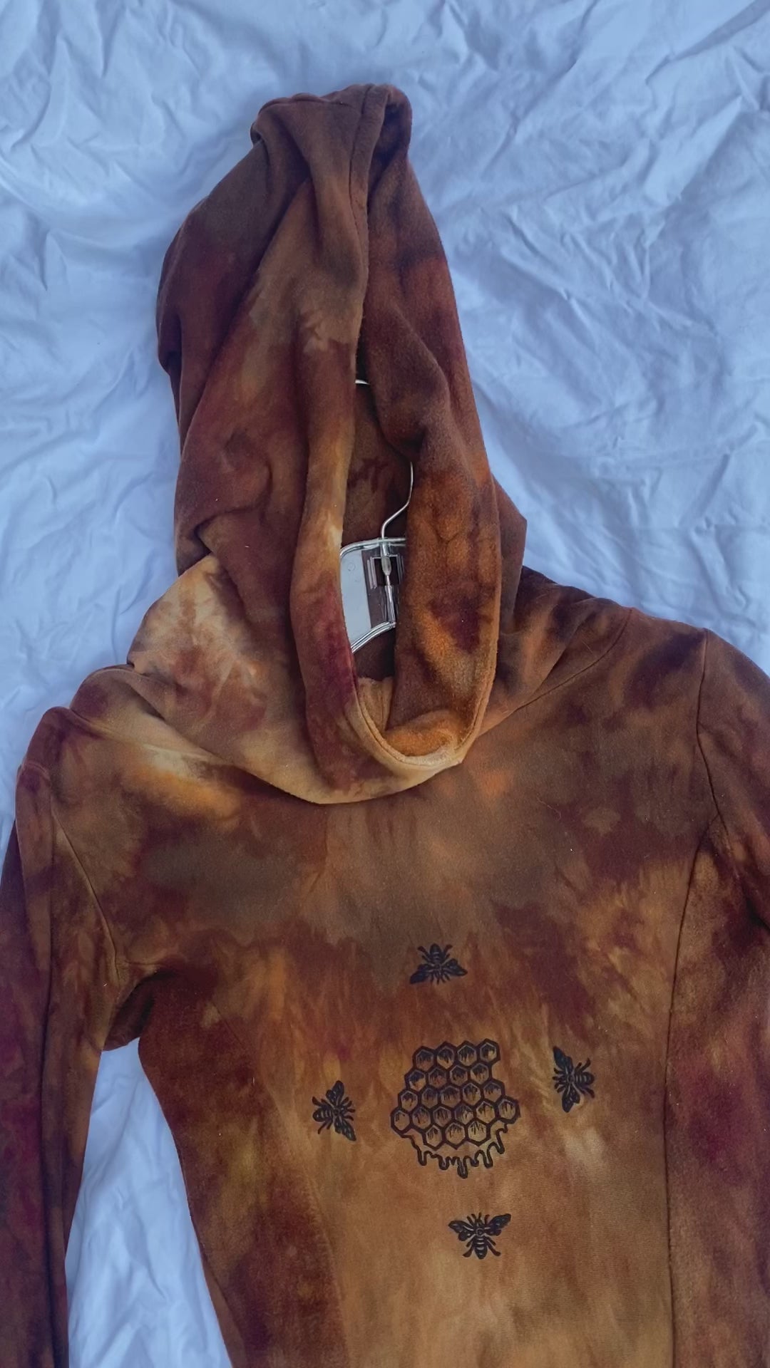 Brand: Blossoming Bumble, size xs/s, Bamboo fleece, handmade, pockets, hood, verrrry flattering and stretchy, gorgeous dye job - I had to lighten pics so look at video as well for better idea of color.