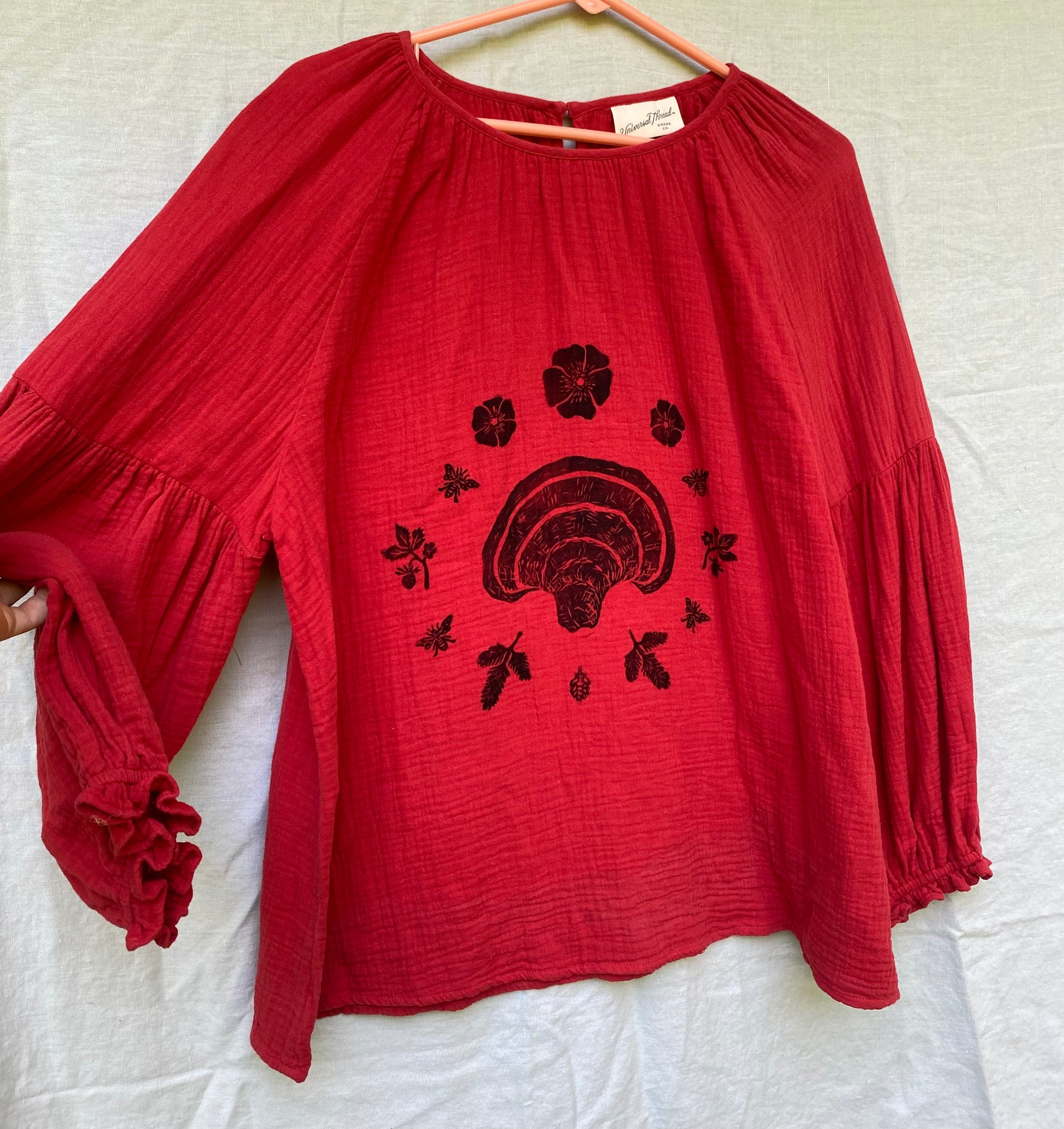 Brand: Universal Threads, size XXL, 100% cotton gauze, cute ruffle and gentle puff sleeves, reddish orange color