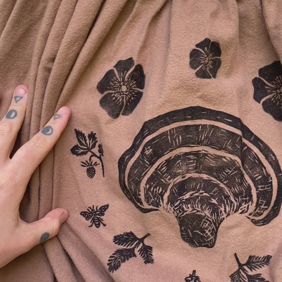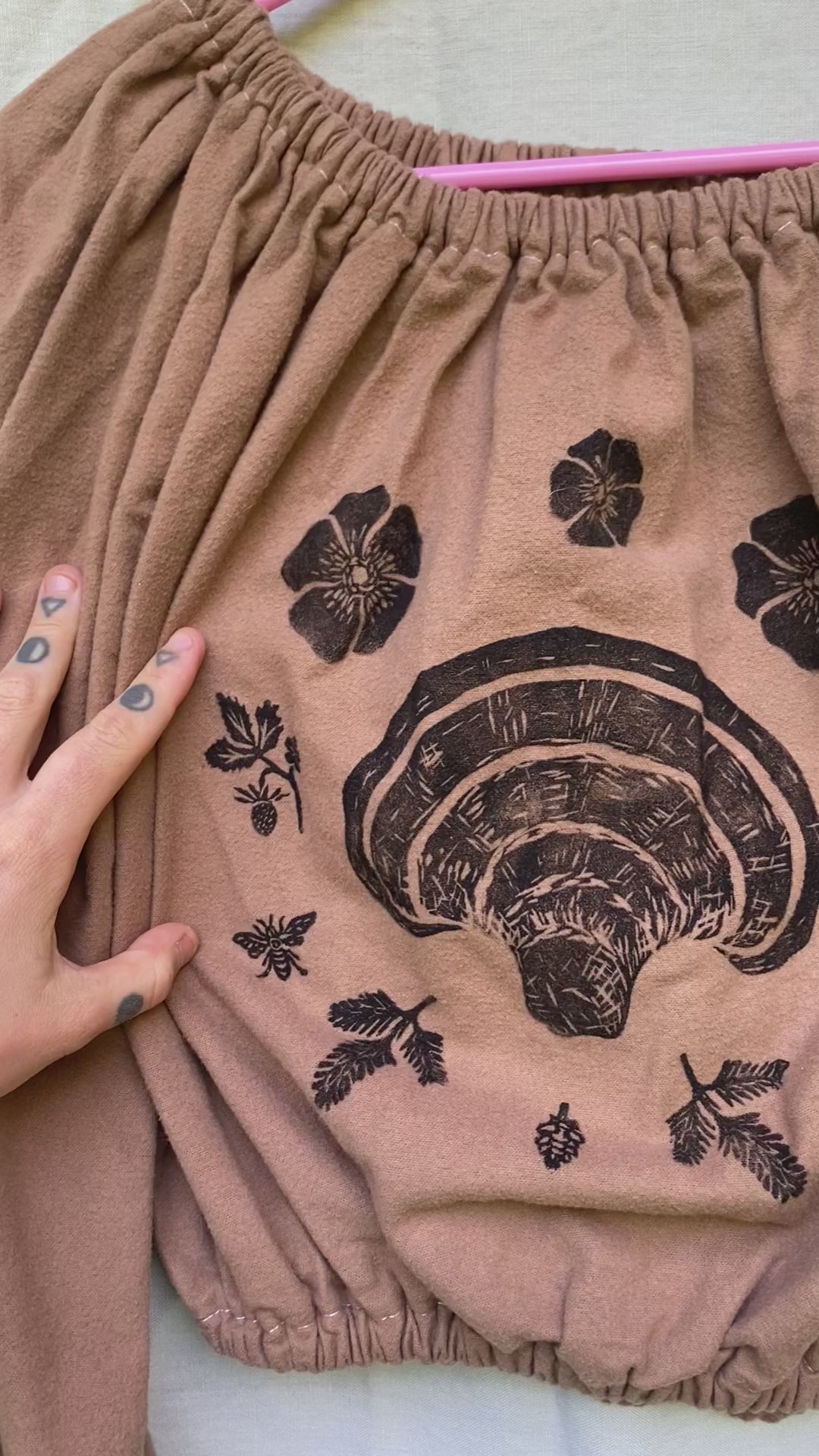 Up-cycled, one of a kind, hand-printed with hand-carved stamps, inspired by the beauty and magic of the early summer glory, solstice time, the full strawberry moon.